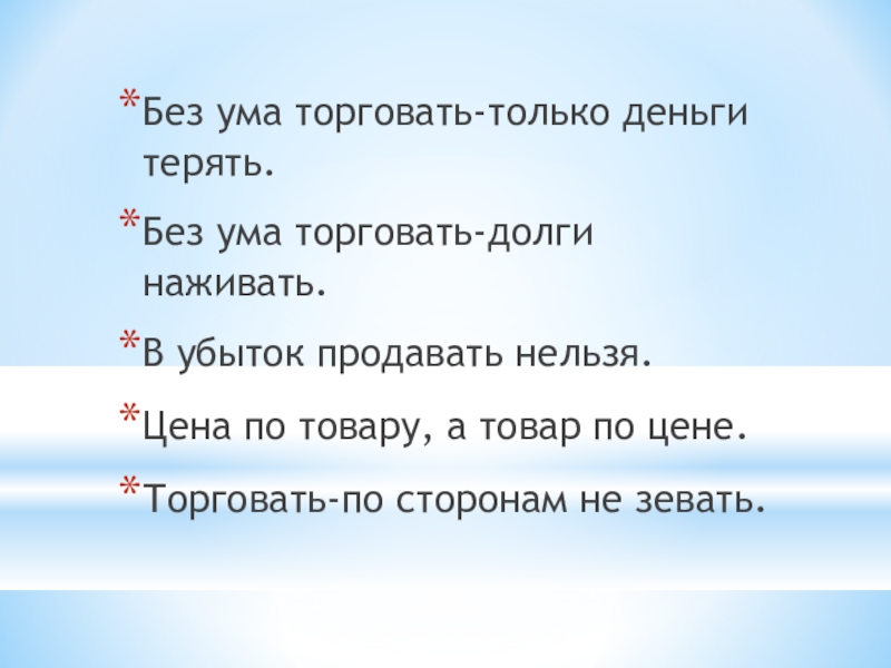 Без ума торговать-только деньги терять.Без ума торговать-долги наживать.В убыток продавать нельзя.Цена по товару, а товар по цене.Торговать-по