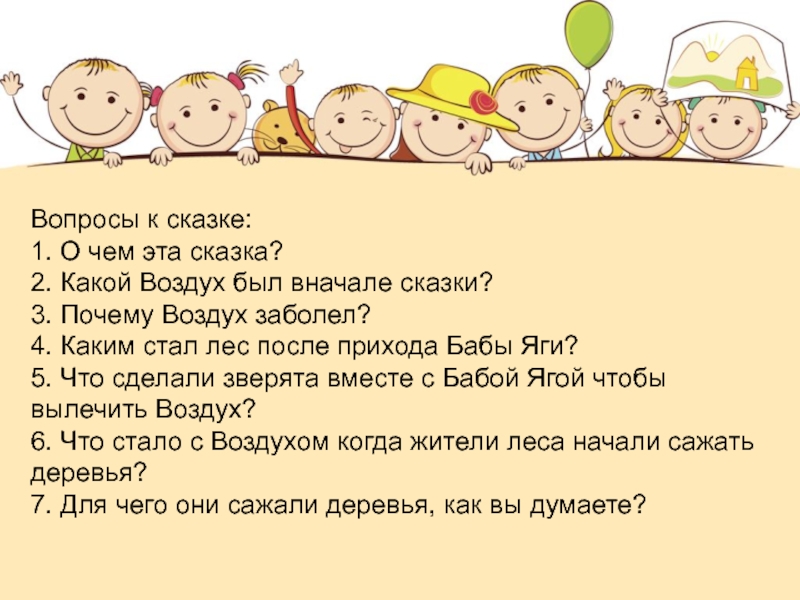 Вопросы к сказке:1. О чем эта сказка?2. Какой Воздух был вначале сказки?3. Почему Воздух заболел?4. Каким стал
