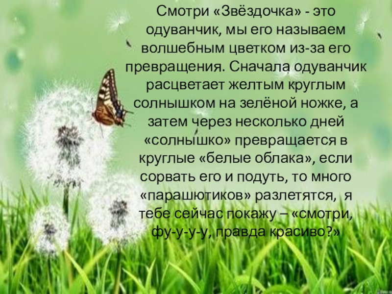 Слайд 6Смотри «Звёздочка» - это одуванчик, мы его называем волшебным цветком из-за