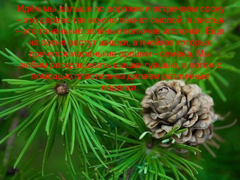 Слайд 4 Идём мы дальше по дорожке и встречаем сосну – это