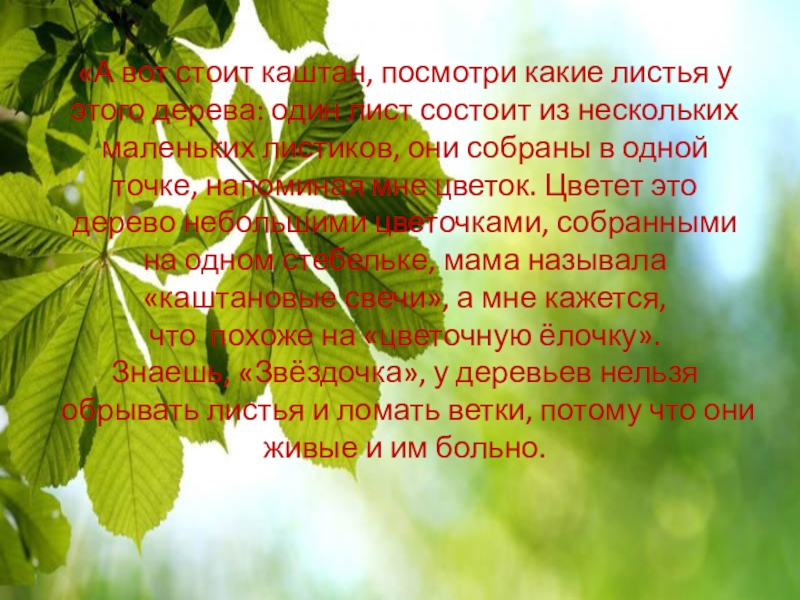 Слайд 5«А вот стоит каштан, посмотри какие листья у этого дерева: один