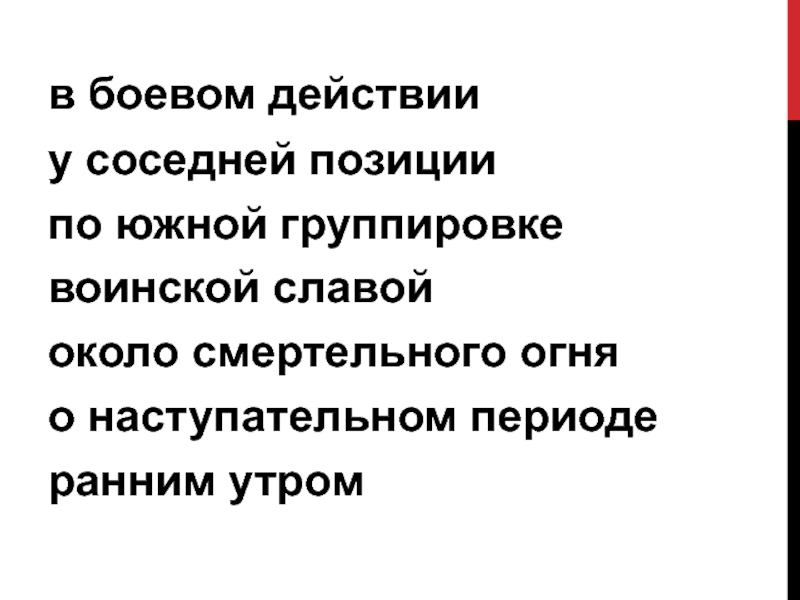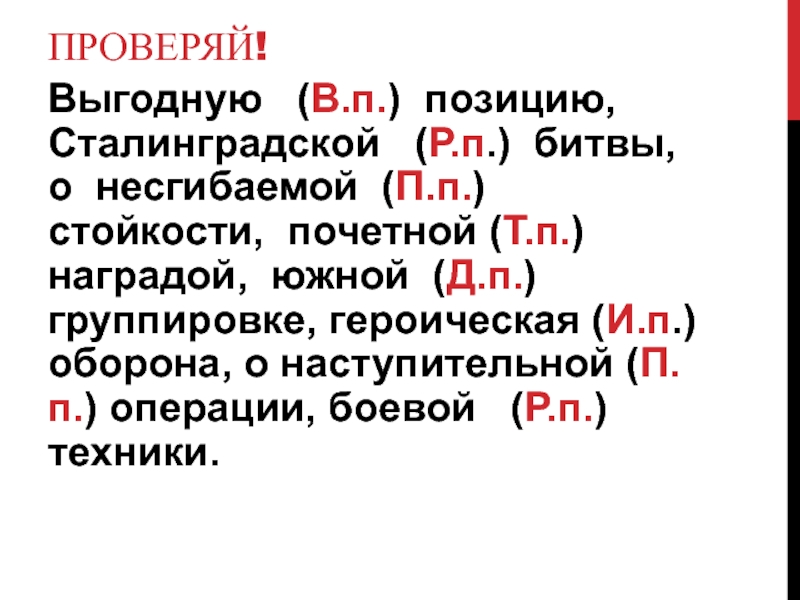Выгодную (В.п.) позицию, Сталинградской (Р.п.) битвы, о несгибаемой (П.п.)