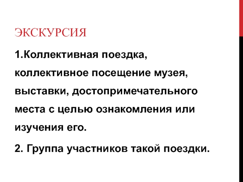 1.Коллективная поездка, коллективное посещение музея, выставки, достопримечательного места с целью ознакомления