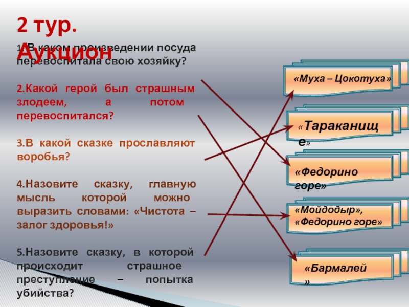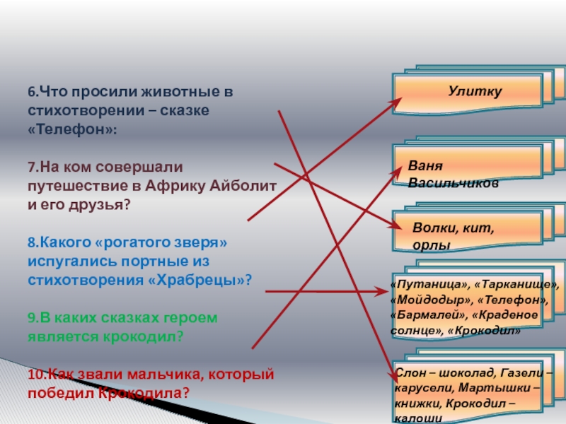 «Путаница», «Тарканище», «Мойдодыр», «Телефон», «Бармалей», «Краденое солнце», «Крокодил»