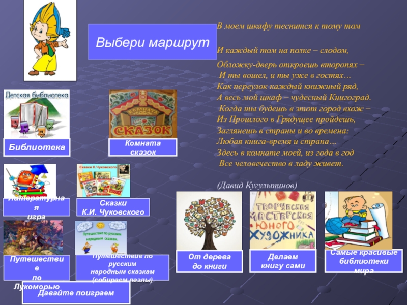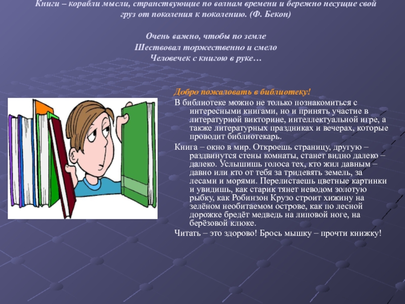 Книга – окно в мир. Откроешь страницу, другую – раздвинутся стены комнаты, станет видно далеко – далеко. Услышишь голоса тех, кто жил давным – давно или кто от тебя за тридевять земель, за лесами и морями. Перелистаешь цветные картинки и увидишь, как старик тянет неводом золотую рыбку, как Робинзон Крузо строит хижину на зелёном необитаемом острове, как по лесной дорожке бредёт медведь на липовой ноге, на берёзовой клюке.