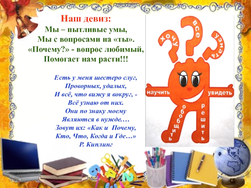 Это сайт презентаций, где можно хранить и обмениваться своими презентациями, докладами, проектами, шаблонами в формате PowerPoint с другими пользователями. Мы помогаем школьникам, студентам, учителям, преподавателям хранить и обмениваться учебными материалами.
