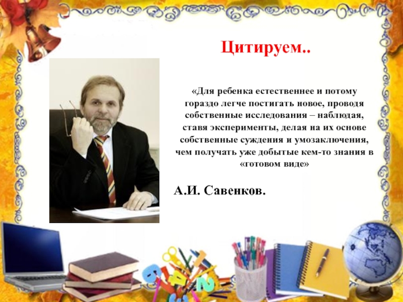 «Для ребенка естественнее и потому гораздо легче постигать новое, проводя собственные исследования – наблюдая, ставя эксперименты, делая на их основе собственные суждения и умозаключения, чем получать уже добытые кем-то знания в «готовом виде»