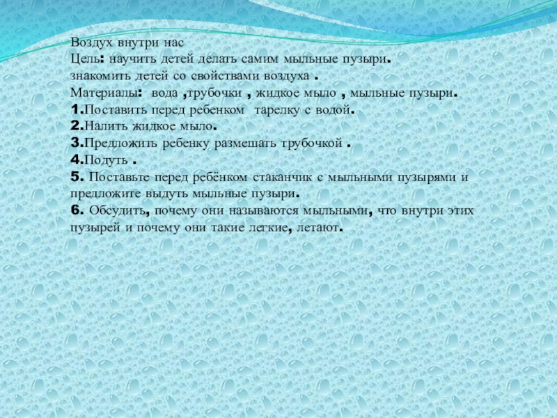 Материалы: вода ,трубочки , жидкое мыло , мыльные пузыри.