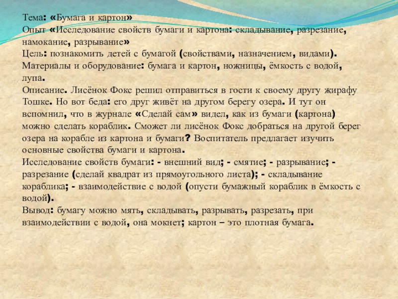 Описание. Лисёнок Фокс решил отправиться в гости к своему другу жирафу Тошке. Но вот беда: его друг живёт на другом берегу озера. И тут он вспомнил, что в журнале «Сделай сам» видел, как из бумаги (картона) можно сделать кораблик. Сможет ли лисёнок Фокс добраться на другой берег озера на корабле из картона и бумаги? Воспитатель предлагает изучить основные свойства бумаги и картона.
