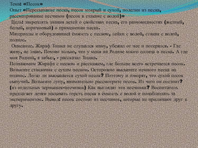 Познакомим Жирафа с песком и расскажем, где больше всего встречается песок. Возьмите стаканчик с сухим песком. Осторожно высыпите немного песка на поднос. Легко ли высыпается сухой песок? Поэтому и говорят, что сухой песок сыпучий. Возьмите лупу, внимательно рассмотрите песок. Из чего он состоит? (из отдельных зернышек-песчинок) Как выглядят эти песчинки? Воспитатель предлагает детям насыпать горсть песка в ёмкость с водой и понаблюдать за экспериментом. Вывод: песок состоит из песчинок, которые не прилипают друг к другу.
