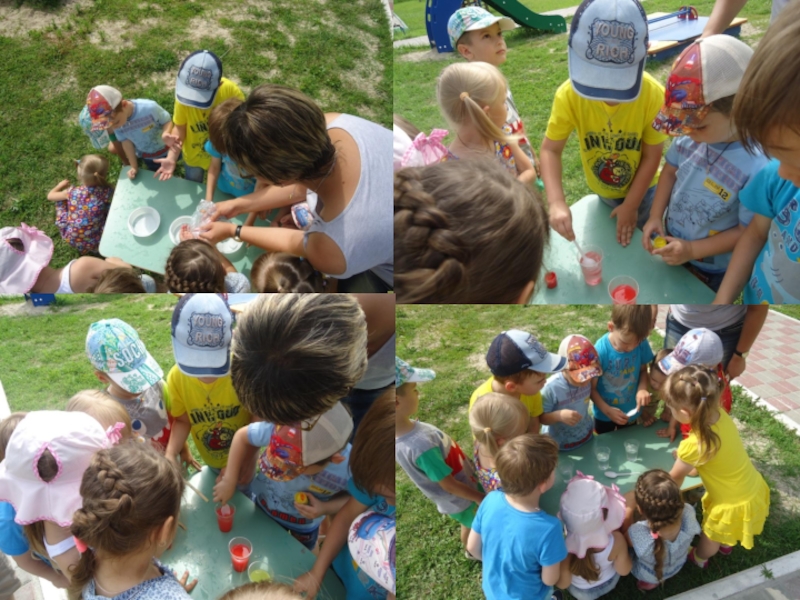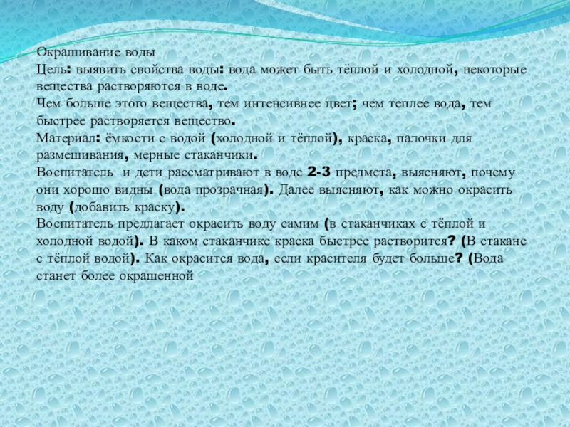 Воспитатель предлагает окрасить воду самим (в стаканчиках с тёплой и холодной водой). В каком стаканчике краска быстрее растворится? (В стакане с тёплой водой). Как окрасится вода, если красителя будет больше? (Вода станет более окрашенной