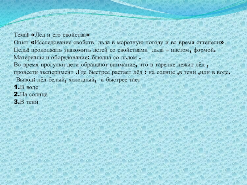 Во время прогулки дети обращают внимание, что в тарелке лежит лёд ,провести эксперимент .Где быстрее растает лёд : на солнце ,в тени ,или в воде.