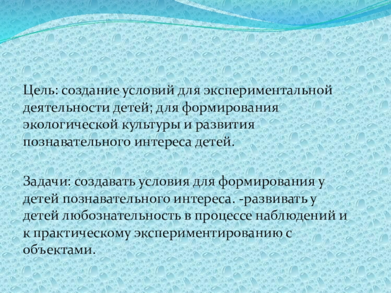 Задачи: создавать условия для формирования у детей познавательного интереса. -развивать у детей любознательность в процессе наблюдений и к практическому экспериментированию с объектами.