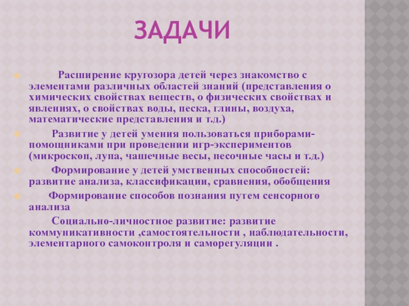 (представления о химических свойствах веществ, о физических свойствах и явлениях, о свойствах воды, песка, глины, воздуха, математические представления и т.д.)