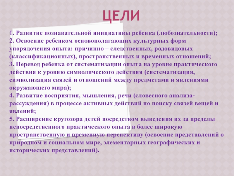 5. Расширение кругозора детей посредством выведения их за пределы непосредственного практического опыта в более широкую пространственную и временную перспективу (освоение представлений о природном и социальном мире, элементарных географических и исторических представлений).