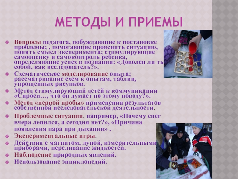 Проблемные ситуации, например, «Почему снег вчера лепился, а сегодня нет?», «Причина появления пара при дыхании» .