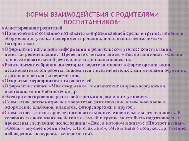 Родительские собрания, на которых родители узнают о форме организации исследовательской работы, знакомятся с исследовательскими методами обучения, с разновидностью экспериментов.