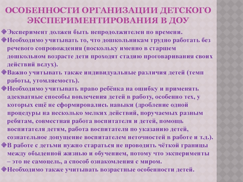 Слайд 8Особенности организации детского экспериментирования в ДОУ