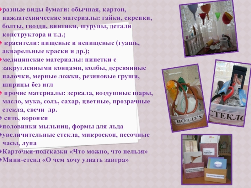 помощь в оборудовании уголка экспериментирования, пополнении необходимыми материалами