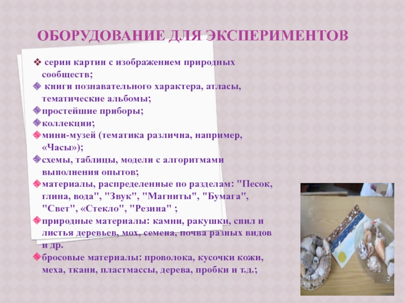 материалы, распределенные по разделам: "Песок, глина, вода", "Звук", "Магниты", "Бумага", "Свет", «Стекло", "Резина" ;