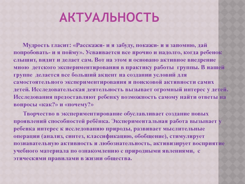 я запомню, дай попробовать- и я пойму». Усваивается все прочно и надолго, когда ребенок слышит, видит и делает сам. Вот на этом и основано активное внедрение мною детского экспериментирования в практику работы группы. В нашей группе делается все больший акцент на создании условий для самостоятельного экспериментирования и поисковой активности самих детей. Исследовательская деятельность вызывает огромный интерес у детей. Исследования предоставляют ребенку возможность самому найти ответы на вопросы «как?» и «почему?»