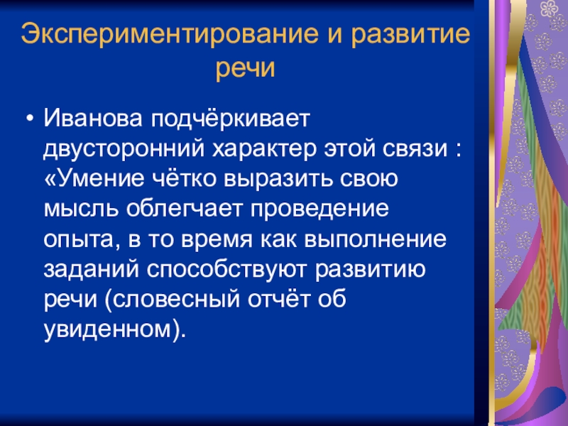 чётко выразить свою мысль облегчает проведение опыта, в то время как выполнение заданий способствуют развитию речи (словесный отчёт об увиденном).