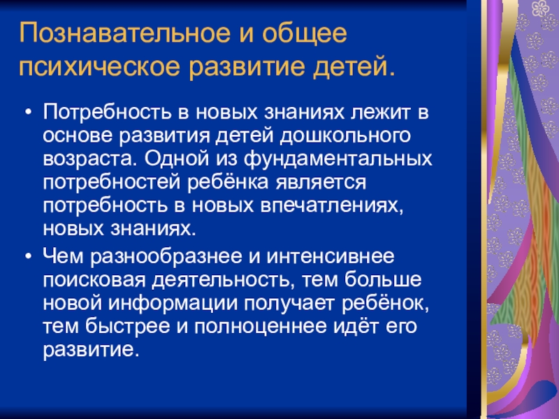 основе развития детей дошкольного возраста. Одной из фундаментальных потребностей ребёнка является потребность в новых впечатлениях, новых знаниях.