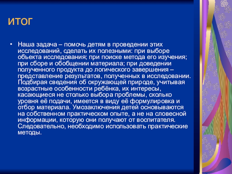 полезными: при выборе объекта исследования; при поиске метода его изучения; при сборе и обобщении материала; при доведении полученного продукта до логического завершения – представление результатов, полученных в исследовании. Подбирая сведения об окружающей природе, учитывая возрастные особенности ребёнка, их интересы, касающиеся не столько выбора проблемы, сколько уровня её подачи, имеется в виду её формулировка и отбор материала. Умозаключения детей основываются на собственном практическом опыте, а не на словесной информации, которую они получают от воспитателя. Следовательно, необходимо использовать практические методы.