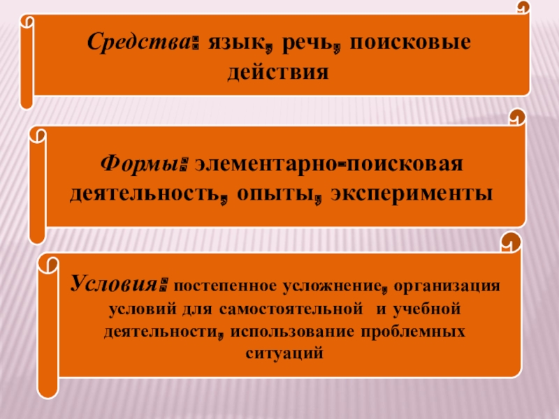 Средства: язык, речь, поисковые действияФормы: элементарно-поисковая деятельность, опыты, экспериментыУсловия: постепенное усложнение, организация условий для самостоятельной и учебной