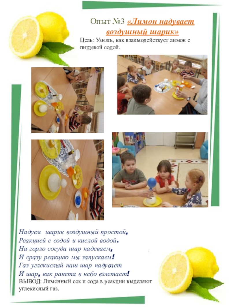 ВЫВОД: Лимонный сок и сода в реакции выделяют углекислый газ.