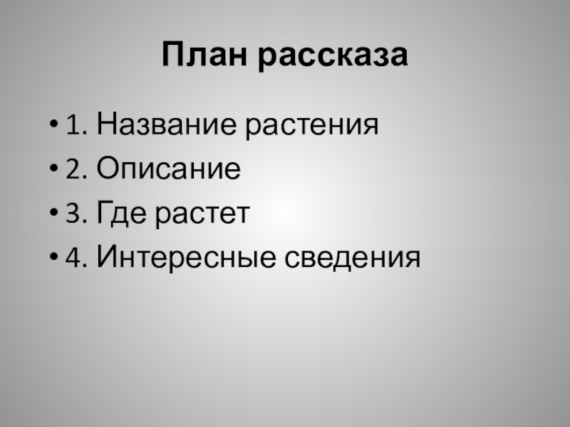 План рассказа1. Название растения2. Описание3. Где растет4. Интересные сведения