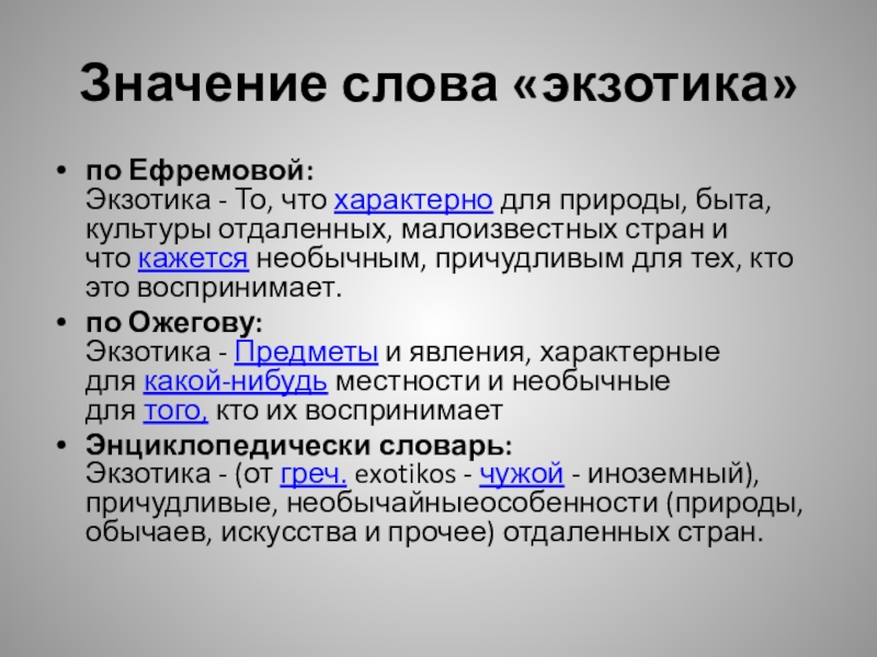 Значение слова «экзотика»по Ефремовой: Экзотика - То, что характерно для природы, быта, культуры отдаленных, малоизвестных стран и что кажется необычным, причудливым