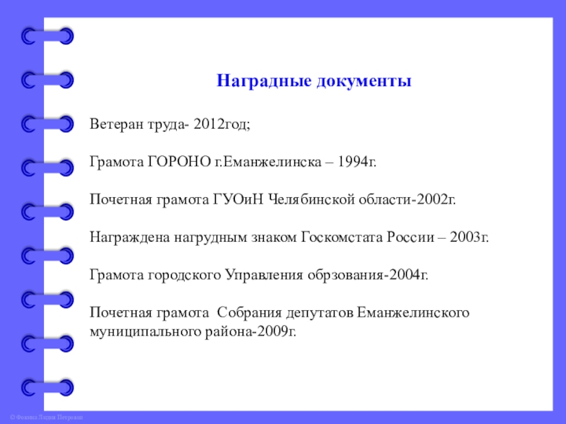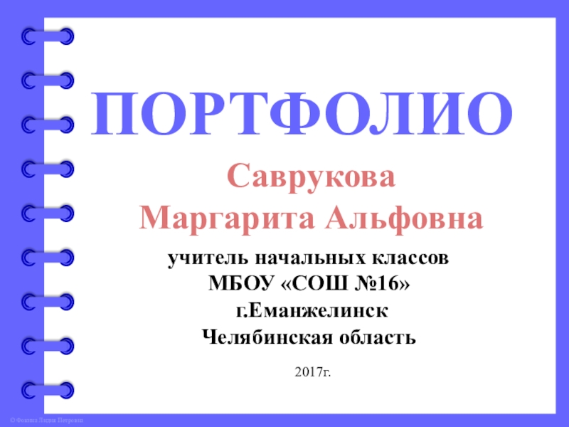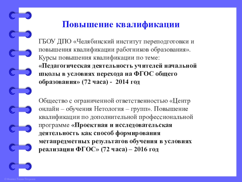 Образование – Миасское педагогическое училище 1986г. Специальность «Преподавание в начальных классах общеобразовательной школы», квалификация – учитель начальных классов.