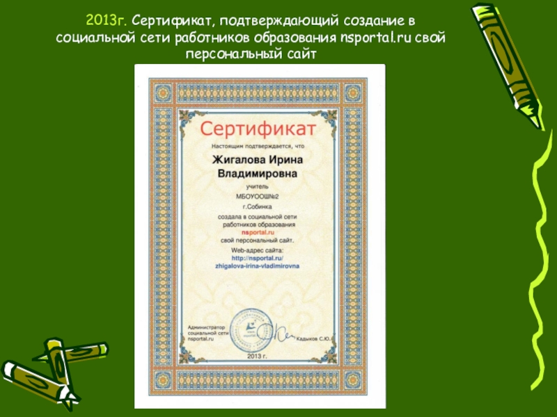 2013г. Сертификат, подтверждающий создание в социальной сети работников образования nsportal.ru свой персональный сайт