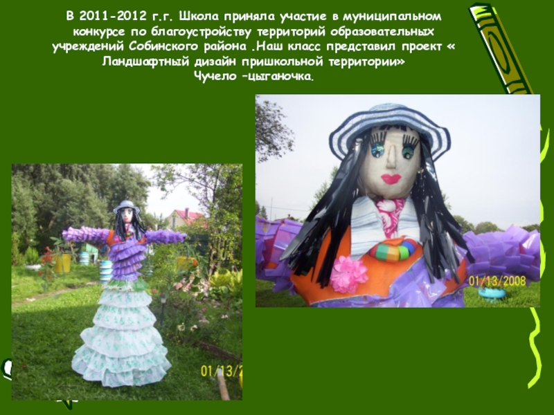 территорий образовательных учреждений Собинского района .Наш класс представил проект « Ландшафтный дизайн пришкольной территории» Чучело –цыганочка.
