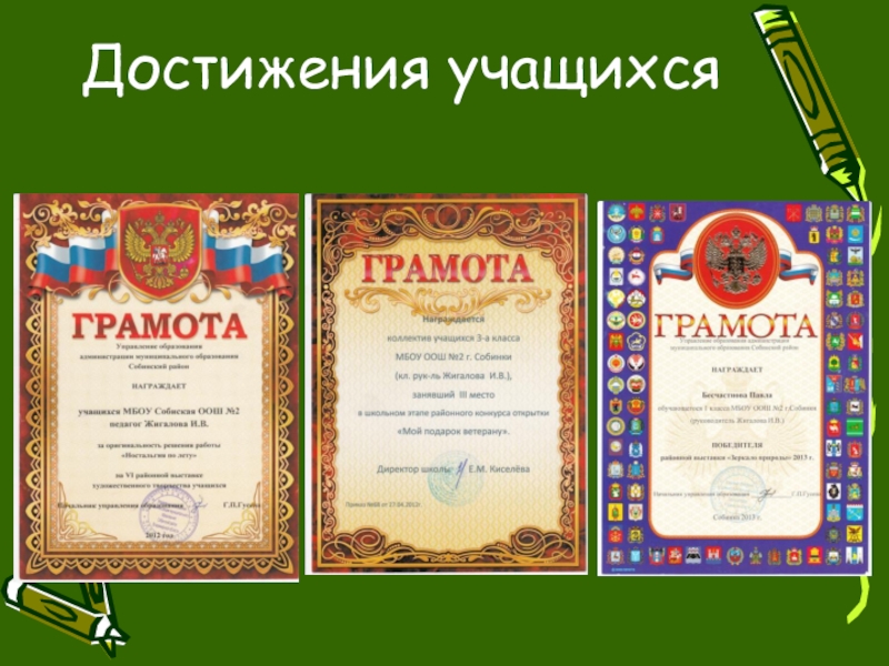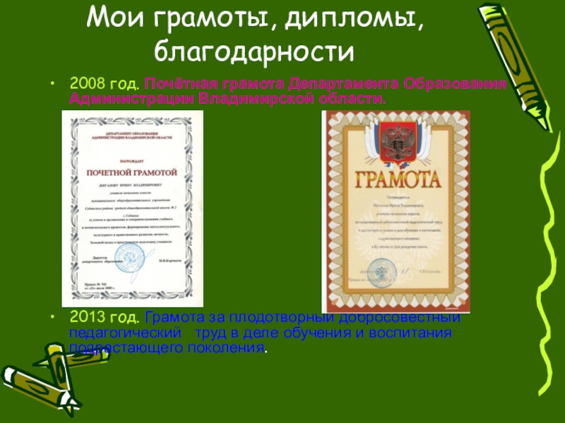 Мои грамоты, дипломы, благодарности2008 год. Почётная грамота Департамента Образования Администрации Владимирской области.2013 год. Грамота за плодотворный добросовестный педагогический
