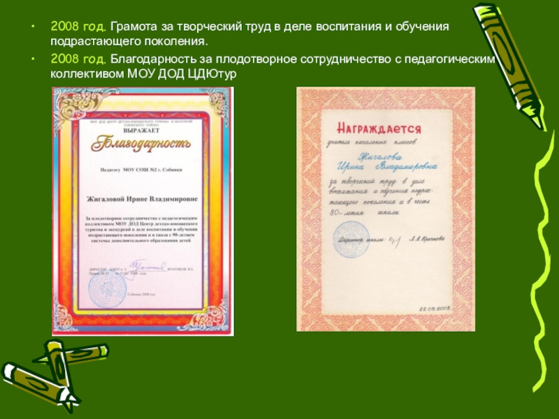 2008 год. Грамота за творческий труд в деле воспитания и обучения подрастающего поколения.2008 год. Благодарность за плодотворное