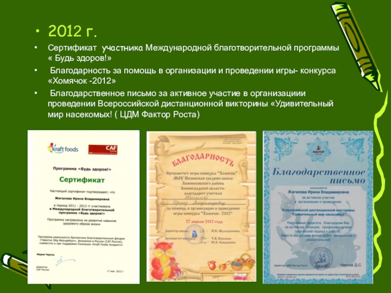 2012 г. Сертификат участника Международной благотворительной программы « Будь здоров!» Благодарность за помощь в организации и проведении