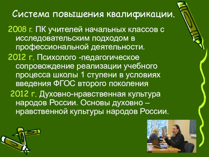 Система повышения квалификации.2008 г. ПК учителей начальных классов с исследовательским подходом в профессиональной деятельности.2012 г. Психолого -педагогическое сопровождение