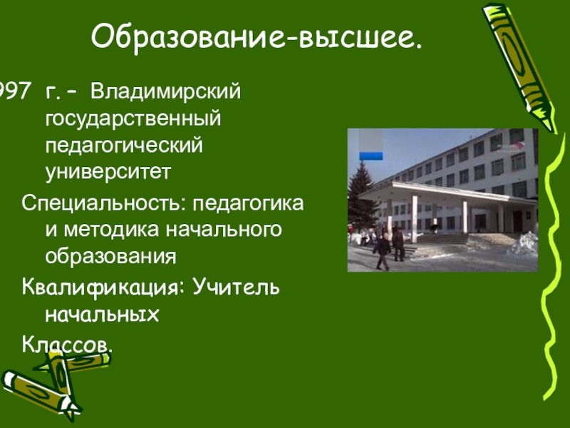 Образование-высшее.г. – Владимирский государственный педагогический университетСпециальность: педагогика и методика начального образованияКвалификация: Учитель начальныхКлассов.