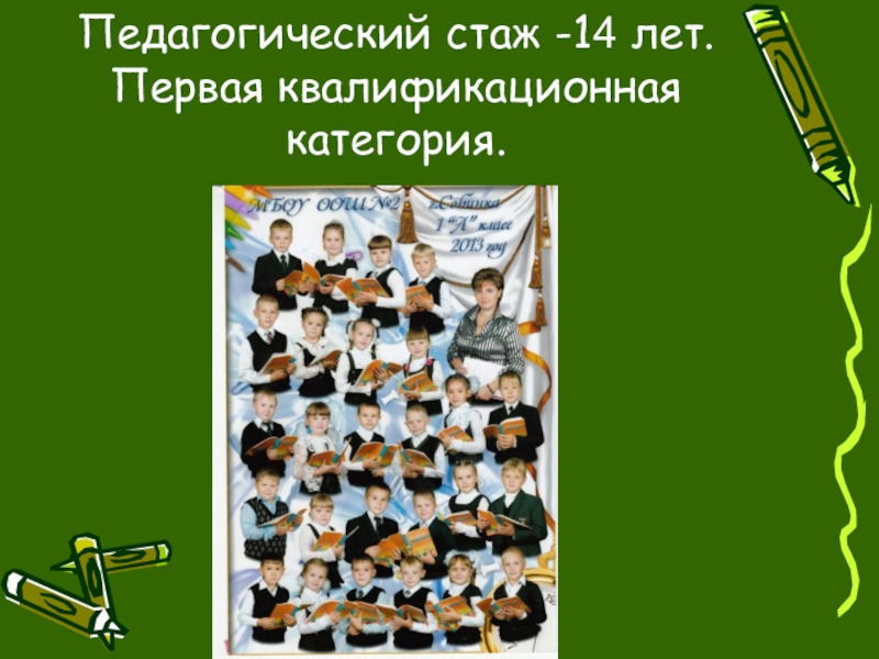 Слайд 3Педагогический стаж -14 лет. Первая квалификационная категория.