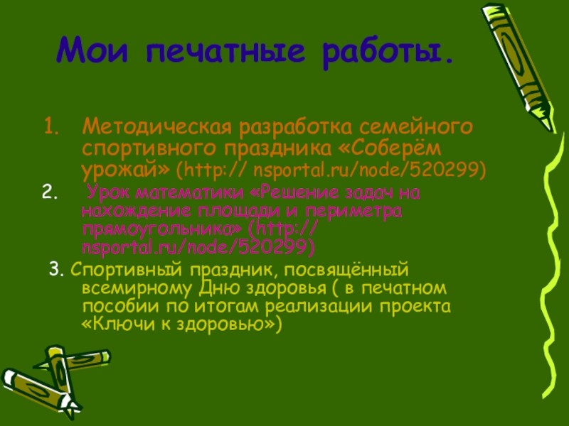 Мои печатные работы.Методическая разработка семейного спортивного праздника «Соберём урожай» (http:// nsportal.ru/node/520299) Урок математики «Решение задач на нахождение