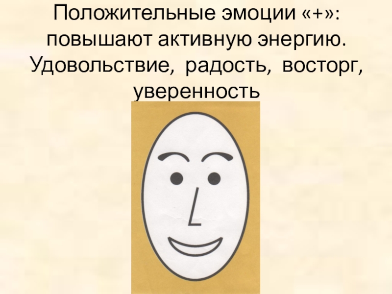 Слайд 3Положительные эмоции «+»: повышают активную энергию. Удовольствие, радость, восторг, уверенность