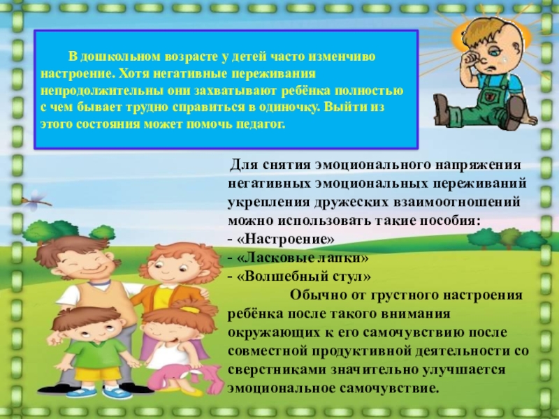 Для снятия эмоционального напряжения негативных эмоциональных переживаний укрепления дружеских взаимоотношений можно использовать такие пособия: