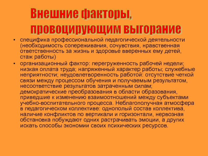 организационный фактор: перегруженность рабочей недели; низкая оплата труда; напряженный характер работы; служебные неприятности; неудовлетворенность работой: отсутствие четкой связи между процессом обучения и получаемым результатом, несоответствие результатов затраченным силам; демократические преобразования в области образования, приведшие к изменению взаимоотношений между субъектами учебно-воспитательного процесса. Неблагополучная атмосфера в педагогическом коллективе: однополый состав коллектива, наличие конфликтов по вертикали и горизонтали, нервозная обстановка побуждают одних растрачивать эмоции, а других искать способы экономии своих психических ресурсов.