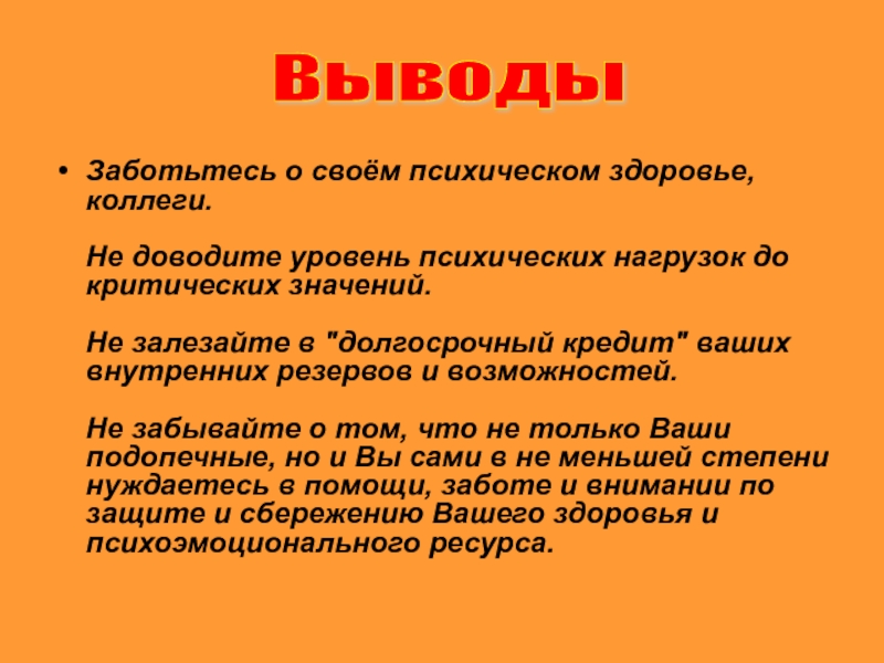 Слайд 31Заботьтесь о своём психическом здоровье, коллеги.