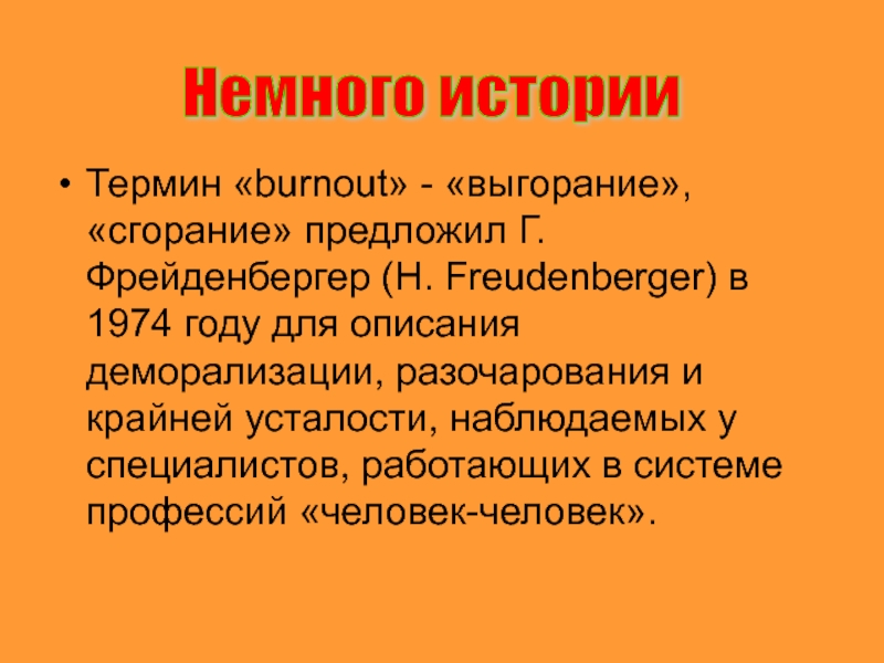 1974 году для описания деморализации, разочарования и крайней усталости, наблюдаемых у специалистов, работающих в системе профессий «человек-человек».