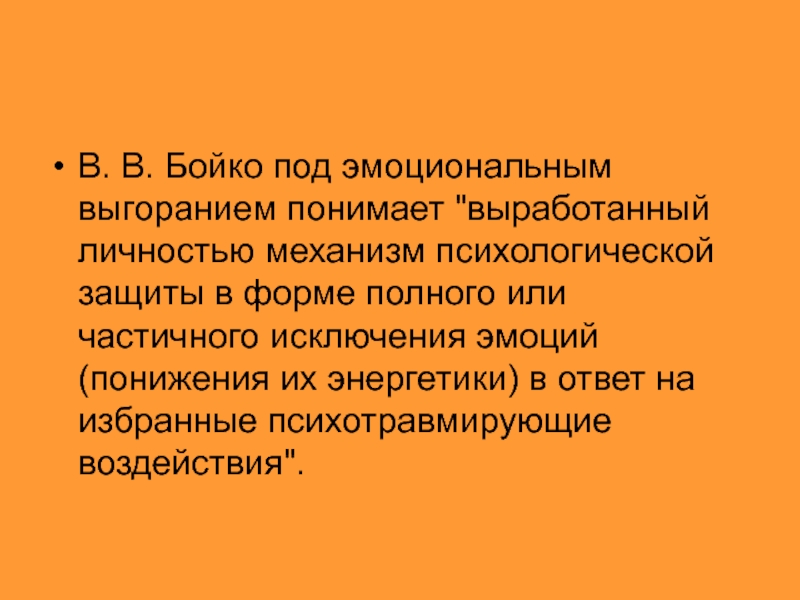 Слайд 4В. В. Бойко под эмоциональным выгоранием понимает "выработанный личностью механизм психологической