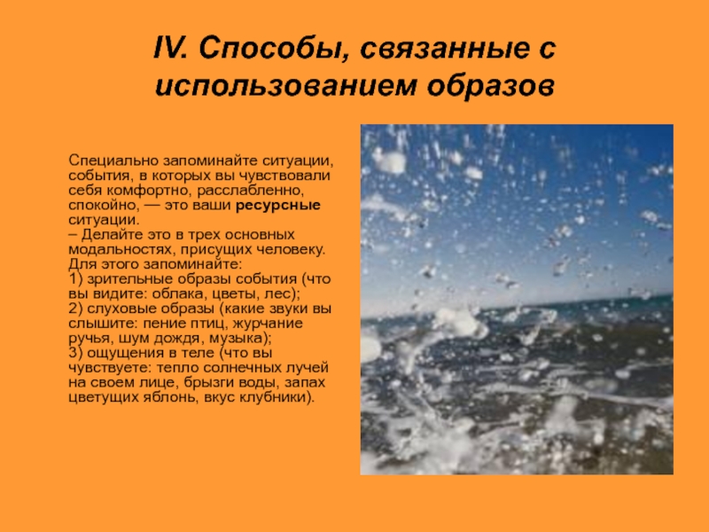3) ощущения в теле (что вы чувствуете: тепло солнечных лучей на своем лице, брызги воды, запах цветущих яблонь, вкус клубники).