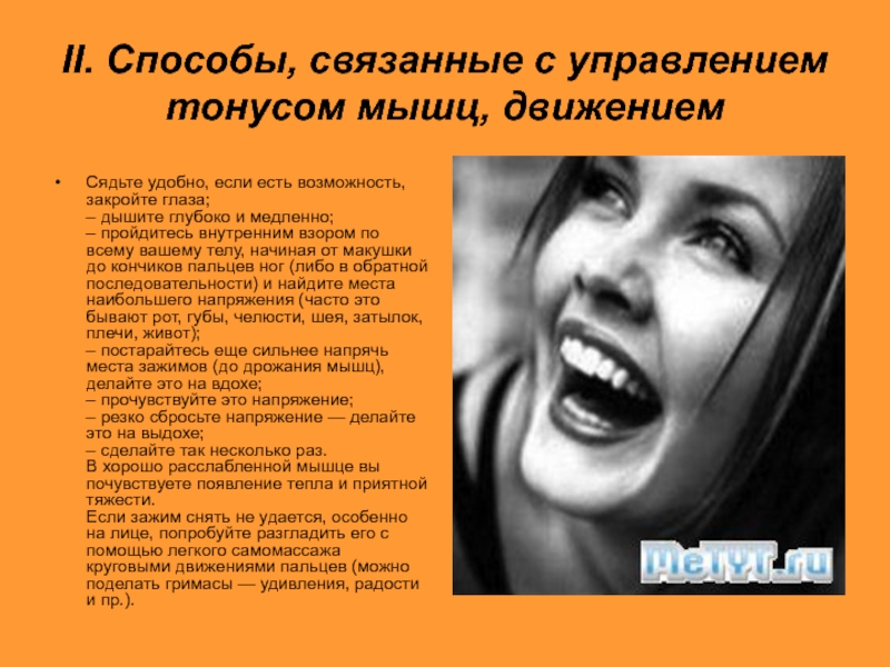 Слайд 28II. Способы, связанные с управлением тонусом мышц, движением